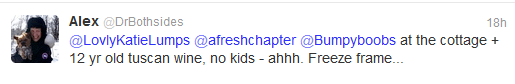 Dr Alexandra Ginty tweeted me, Katie and Terri this week about a freeze frame moment, saying she was enjoying a beautiful wine while at the cottage. And I thought, “what a fantastic expression, ‘freeze frame’.”